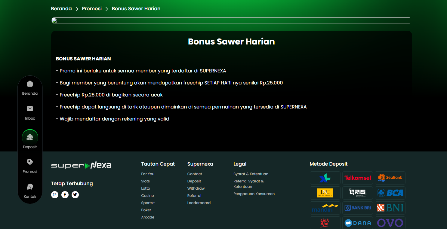 Supernexa bagi-bagi bonus harian! Dapatkan Bonus Sawer Harian senilai Rp 25.000 yang berlaku untuk SEMUA member. Daftar akun sekarang dan klaim keuntungannya setiap hari!